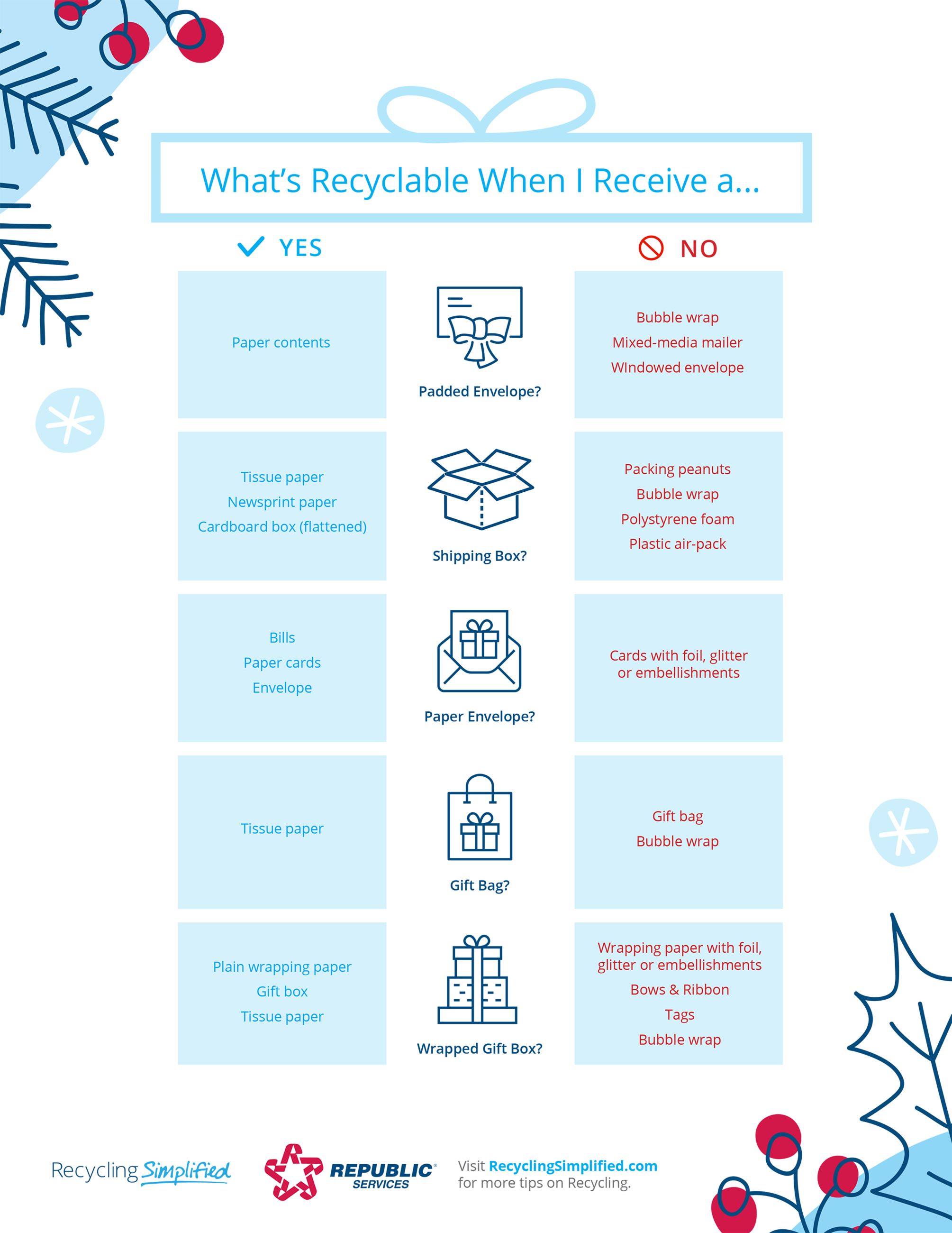 Holiday Recycling Tips During the holiday season, household waste increases by 25%, which can add 1 million tons of trash to our landfills. View the image from Republic Services to discover what to throw away and what to recycle.
